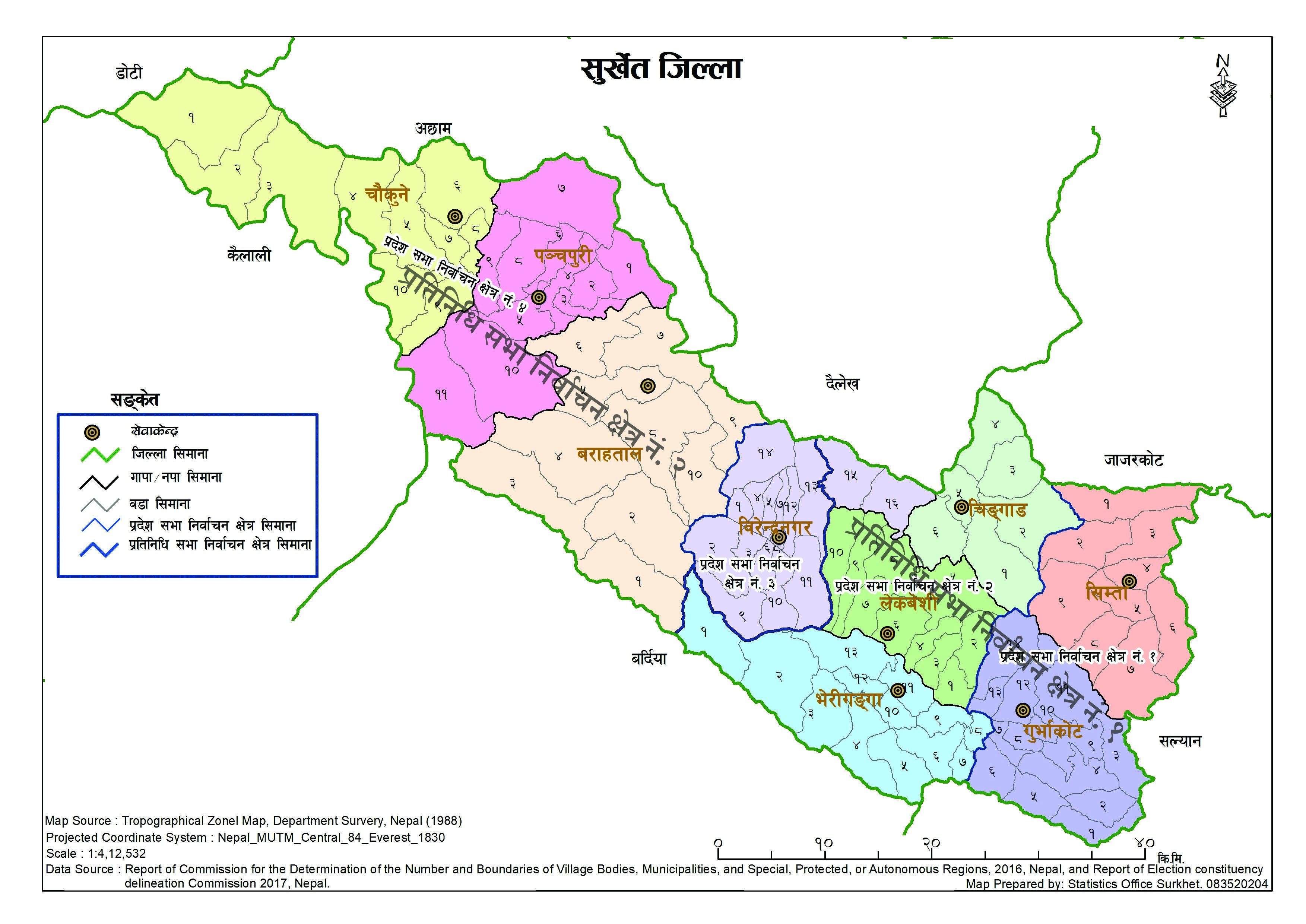 सुर्खेत चुरे र महाभारत श्रृंखलाको बिचमा अवस्थित कमजोर धरातल भएको भू–भागले बनेको पहाडी जिल्ला हो । यसको भौगालिक अवस्थिति २८०२०’’ – २८०५८’’ उत्तरी अक्षांश र ८००५९’’–८२००२’’ पूर्वी देशान्तरभित्र रहेको छ । समुन्द्र सतहबाट १९८ मी. देखि २३६७ मी. सम्मको उचाईमा रहेको यस जिल्लाको क्षेत्रफल २४५१ वर्ग कि.मी. रहेको छ । यस जिल्लाको पुर्वमा सल्यान र जाजरकोट, पश्चिममा कैलाली, डोटी र अछाम, उत्तरमा दैलेख, दक्षिणमा बाँके र बर्दिया जिल्लाहरु पर्दछन । वि.सं.२०६८ सालको जनगणना अनुसार जिल्लाको कुल जनसंख्या ३,५०,८०४ रहेको छ जसमध्ये पुरुष १,६९,४२१ तथा महिला १,८१,३८३ रहेका छन् । यस जिल्लामा रहेको सहरी क्षेत्रको क्षेत्रफल ३४ बर्ग कि.मि. छ भने ग्रामिण क्षेत्रको क्षेत्रफल २४१७ बर्ग कि.मि. रहेको छ । यस जिल्लालाई प्रतिनिधि सभा सदस्यका लागि २ वटा निर्वाचन क्षेत्र र प्रदेश सभा सदस्य निर्वाचनका लागि ४ वटा क्षेत्रमा विभाजन गरिएको छ । जिल्लामा ५ नगरपालिका तथा ४ गाँउपालिका रहेका छन् । यस जिल्लामा मुख्य गरी ब्राहृमण, क्षेत्री, मगर तथा दलित जातिहरु बसोवास गर्दछन् ।